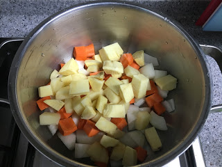 1. 먼저 냄비에 식용유를 두르고, 채소를 한번에 넣습니다.